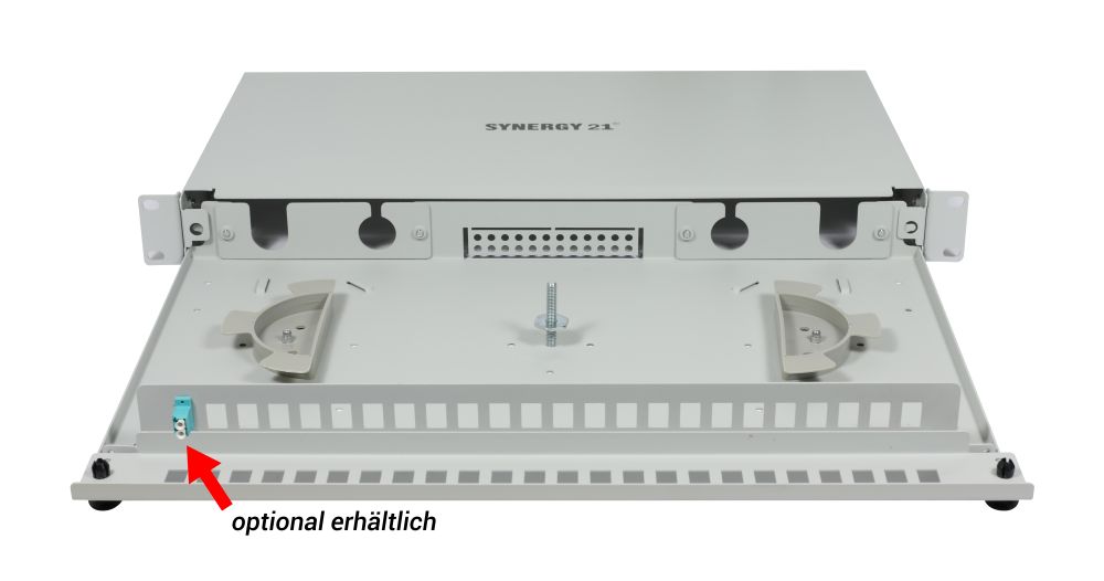 LWL-Patchpanel für 24xLC-Duplex-Buchsen, 19\"/1HE, ohne LC-Kupplungen, Lichtgrau, Synergy 21, 18x LWL-Kupplung,LC-Buchse/LC-Buchse, OM4, 50/125u Multimode, duplex, PVC, Keramikhülse, mit Flansch, Synergy 21