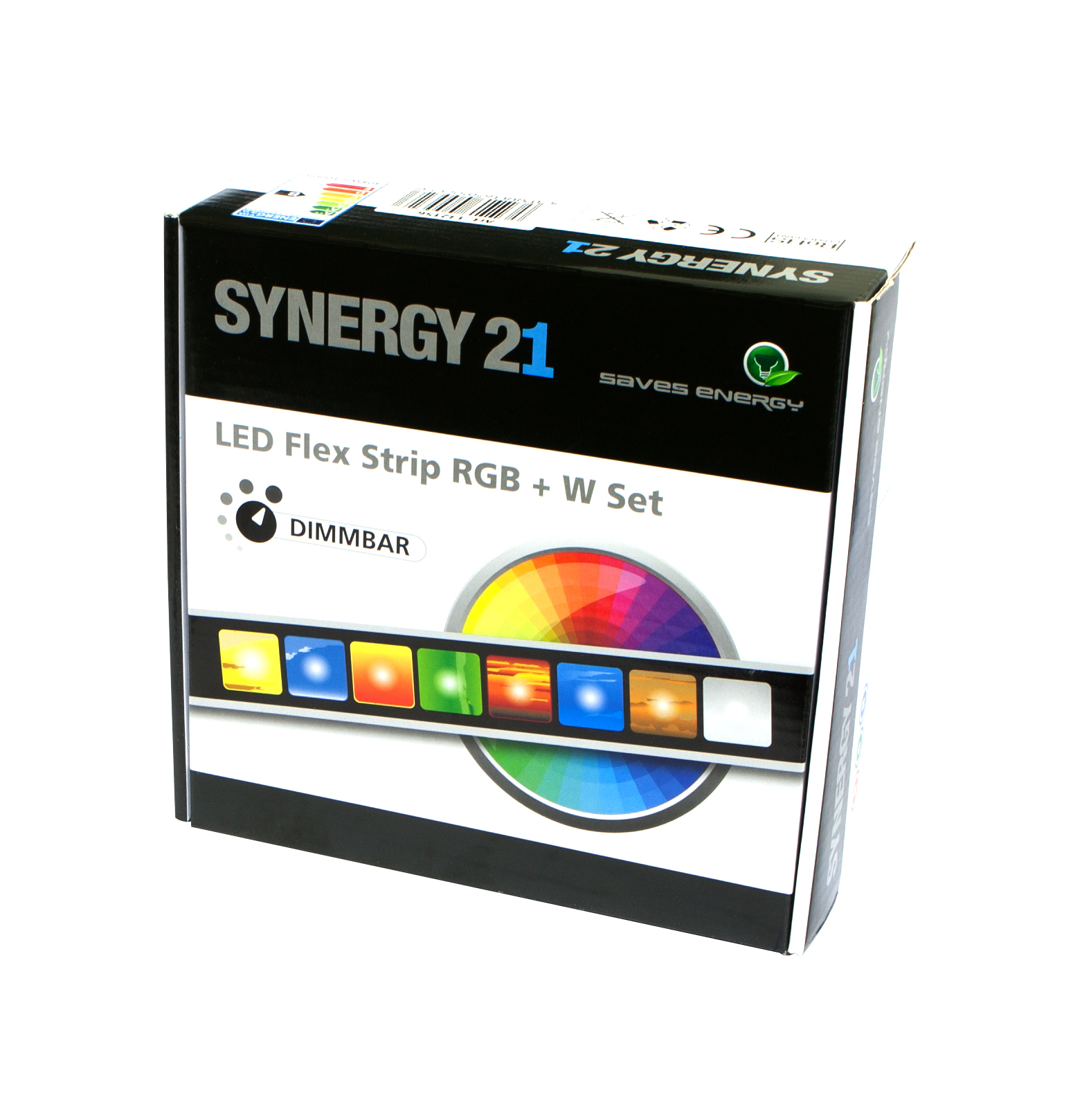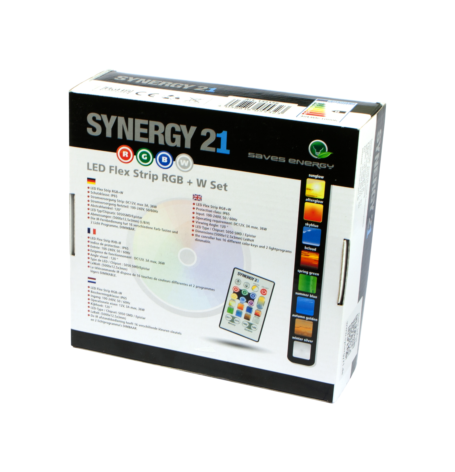 Retail complete set 5m RGB+W Strip incl. power supply unit, controller and IR remote control in attractive and environmentally friendly sales packaging.