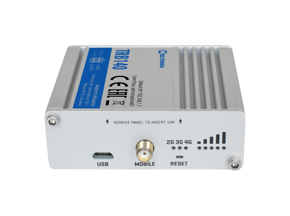Der TRB140 ist ein ultrakleines, leichtes und energieeffizientes Industrie-Gateway, das mit unternehmenskritischen LTE-Kat 4-Funktionen, Gigabit-Ethernet-Schnittstelle, digitalen Ein- und Ausgängen und einem Mikro-USB-Port ausgestattet ist. Aufgrund seines kompakten Designs eignet sich dieses Produkt perfekt für Projekte und Anwendungen, bei denen ein einziges Gadget eine zuverlässige Internetverbindung benötigt. TRB140 wurde speziell für den Einsatz im Industriesektor entwickelt und verfügt über eine breite Palette von Software-Sicherheitsfunktionen wie SMS-Steuerung, Firewall, Open VPN, IPsec, Remote Management System (RMS) und FOTA-Unterstützung.