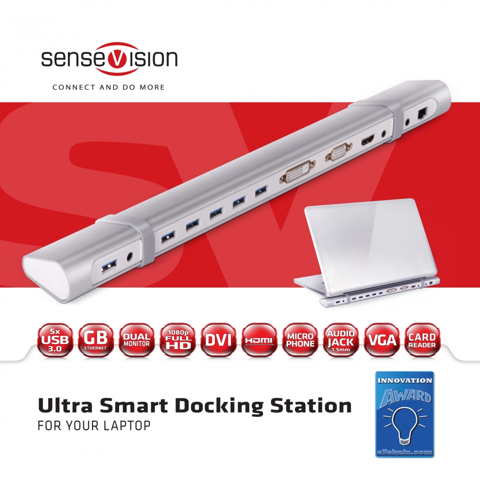 • Ausgänge: HDMI, DVI-D oder VGA, RJ45 Ethernet, 3.5mm Stereo Mini-Jack 2.1ch, 3.5mm Stereo Mikrofon, (micro) SD Kartenleser, 5x Full Size USB 3.0 • Aluminium Stab-Design • Unterstützt zwei externe Monitore, eine über HDMI plus eins über DVI-D oder VGA • Schlanke Abmessungen 372x49x24mm • 5x USB 3.0 Ausgänge • Unterstützt Gigabit Ethernet (10/100/1000) • Unempfindlich für hohe Temperaturen und Beschädigung • Unterstützt Auflösungen bis zu: Für Single Monitor Setup bis zu: 2048x1152 or 1920x1200 bei 60Hz, Für Dual Monitor Setup bis zu: 2x 2048x1152 or 1920x1200 bei 60Hz • Universal Design für Laptops Lenovo / HP / Dell / Toshiba, etc. • Verpackungsgröße: 401x88x89mm • Docking Station: 372x49x24mm • Gewicht: 260g