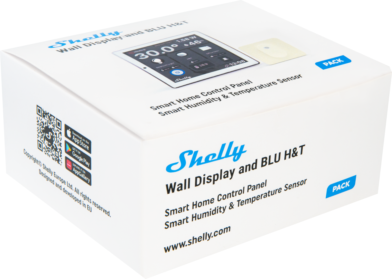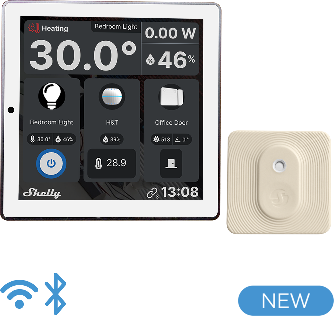 Steuere Deine smarten Geräte mit dem Shelly Wall Display von einem zentralen Ort aus, jetzt in Kombination mit dem Shelly BLU H&T für eine präzise Klimasteuerung.